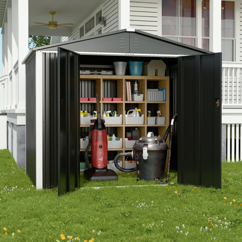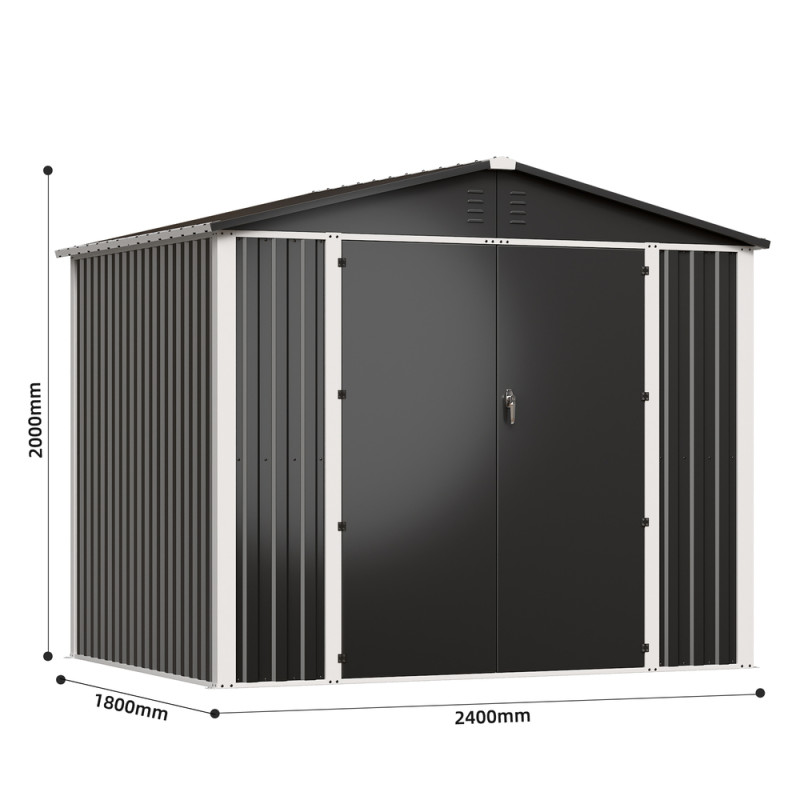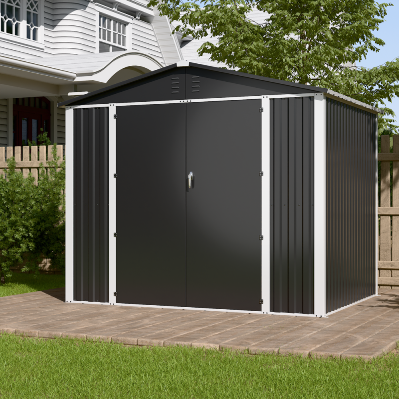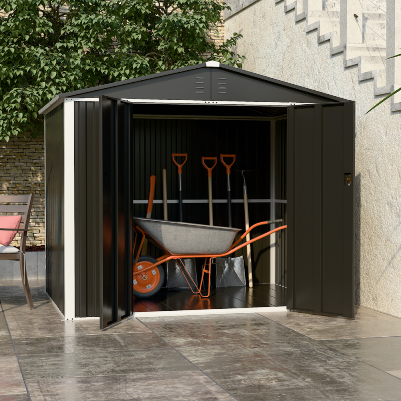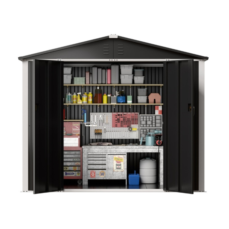 На відміну від дерев’яних або пластикових сараїв, модель DS-03 CUSTOMIZED виготовлена з міцного металу, що гарантує стійкість до погодних умов, ультрафіолету та механічних навантажень. Двосхилий дах не допускає накопичення води чи снігу, продовжуючи термін експлуатації конструкції. А стильний темно-сірий колір надає сараю сучасного вигляду, який пасує як до класичного, так і до мінімалістичного ландшафтного дизайну.