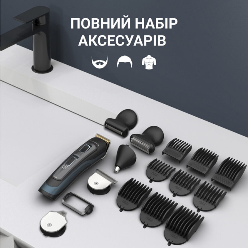 мультитример, 6 телескопических насадок для стрижки головы (3-6-9-12-15-18 мм), 3 телескопические насадки для стрижки бороды, лезвие для стрижки (44 мм), лезвие для бороды (32 мм), насадка для бритья лица (32 мм), насадка для бритья тела ( носа, высокоточный триммер (7 мм), жесткий фирменный чехол для хранения, шнур питания/зарядка, смазка лезвий, щеточка для чистки