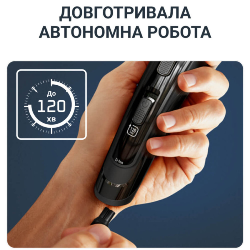 Мультитриммер обеспечивает уход за лицом, телом и волосами – стрижет, подравнивает, формирует контуры бороды, бреет, а также безопасно удаляет волосы в носу и ушах. 36 уровней длины от 0,5 до 18 мм позволяют точно настроить результат в соответствии с вашими предпочтениями. В комплекте — 15 аксессуаров, среди которых насадки для бороды, головы, тела, лица, носа и ушей, точный триммер для мелких деталей, смазка, щеточка для чистки и крепкий чехол для хранения.