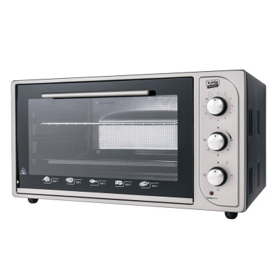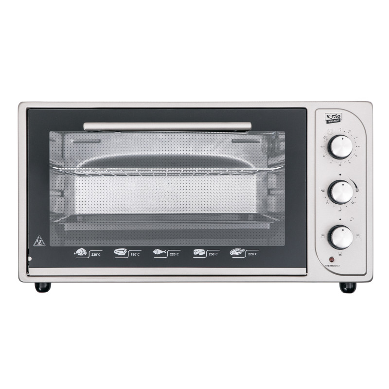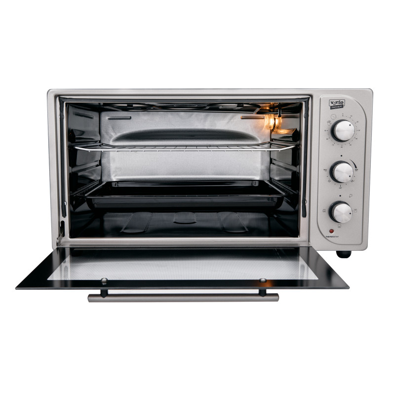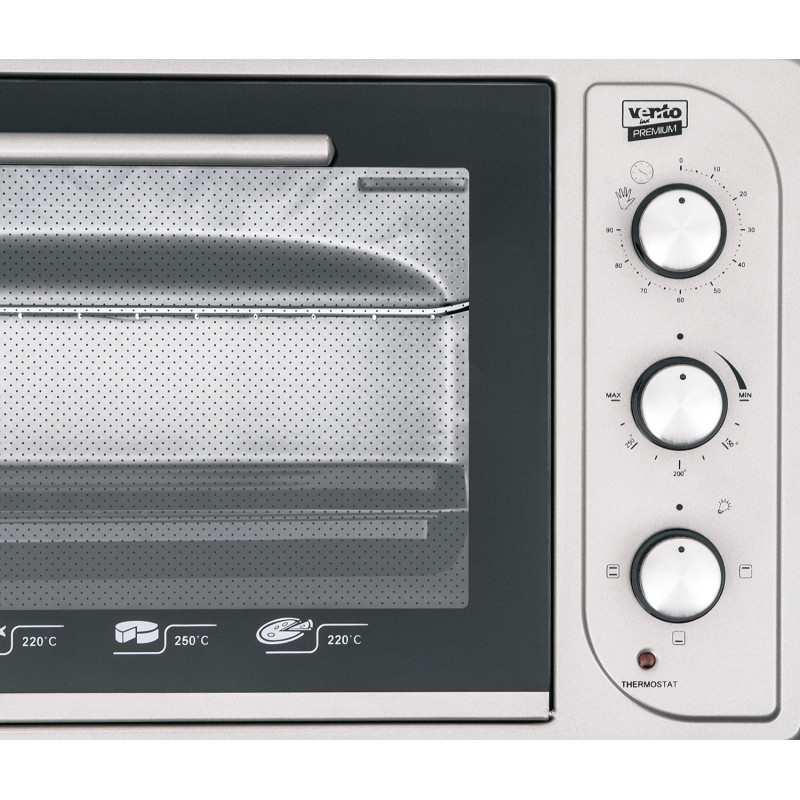 Электропечь MARIA Электрическая настольная печь MARIA – последняя новинка от торговой марки Ventolux. Она разработана специально для небольших кухонь, студентов, любителей отдыха на дачах и покупателей, нежелающих тратиться на встроенный духовой шкаф и соответствующую мебель под нее.. Электродуховка MARIA стильный дизайн, небольшие габариты, качественные комплектующие и доступная цена! Корпус электропечи выполнен из серебристой эмали, потому техника отлично сочетается с любым кухонным интерьером.. Управление осуществляется с помощью трех удобных поворотных ручек, расположенных на боковой панели. Режимы приготовления стандартные – верхний нагревательный элемент, нижний нагревательный элемент и комбинация обоих режимов.. Объем мини-духовки – 45 л, что позволяет готовить блюда на большую семью.. Внутренняя часть электродуховки изготовлена из эмали легкой очистки, которой также покрыт нижний нагревательный элемент. Поэтому уход за техникой легкий и быстрый. Преимущества настольной печи MARIA от Вентолюкс: Компактные габариты. Большой полезный объем – 45 л. Стильный дизайн. Надежные направляющие, предотвращающие самопроизвольное закрытие дверцы. Уплотнитель на корпусе не позволяет терять температуру во время приготовления и исключает вероятность повреждения дверцы из стекла при закрытии.. Для управления мини-печкой предусмотрены 3 механические ручки из бакелита – жаростойкого пластика.. Цена духовки в 3-5 раз ниже стоимости встроенного духового шкафа. ХАРАКТЕРИСТИКИ: Тип - электропечи Цвет - серебристый, черный корпус Материал - эмаль Конвекция - нет Объем, л - 45 Программатор - механический Стекла в дверце, кол-во - 1 Макс. температура, °С – 50-250 Макс. мощность, Вт - 1500 Энергоcпотребление - А Система очистки - эмаль легкой очистки Программ, кол-во - 3-верхний и нижний нагрев, верхний нагрев, нижний нагрев В комплекте - решетка-гриль, прямоугольный противень, круглый противень Питание, В - 220 Автоотключ - есть Внутренняя подсветка - есть Звуковой сигнал - есть Особенности: уплотнитель стеклянной дверцы, защитный крепеж из металла для стекла, плотный крепеж нагревательных элементов, нагревательные элементы из нержавеющей стали, механизм легкой съемки дверцы, индикатор работы, индикатор термостата, автовыключение Таймер, мин. - 90 Функции приготовления - выпечка, гриль, запекание Вес, кг - 15 Вес в упаковке, кг - 16,4 Габарит. размеры (В*Ш*Г), мм – 300*600*400 Размеры упаковки (В*Ш*Г), мм – 350*630*460.