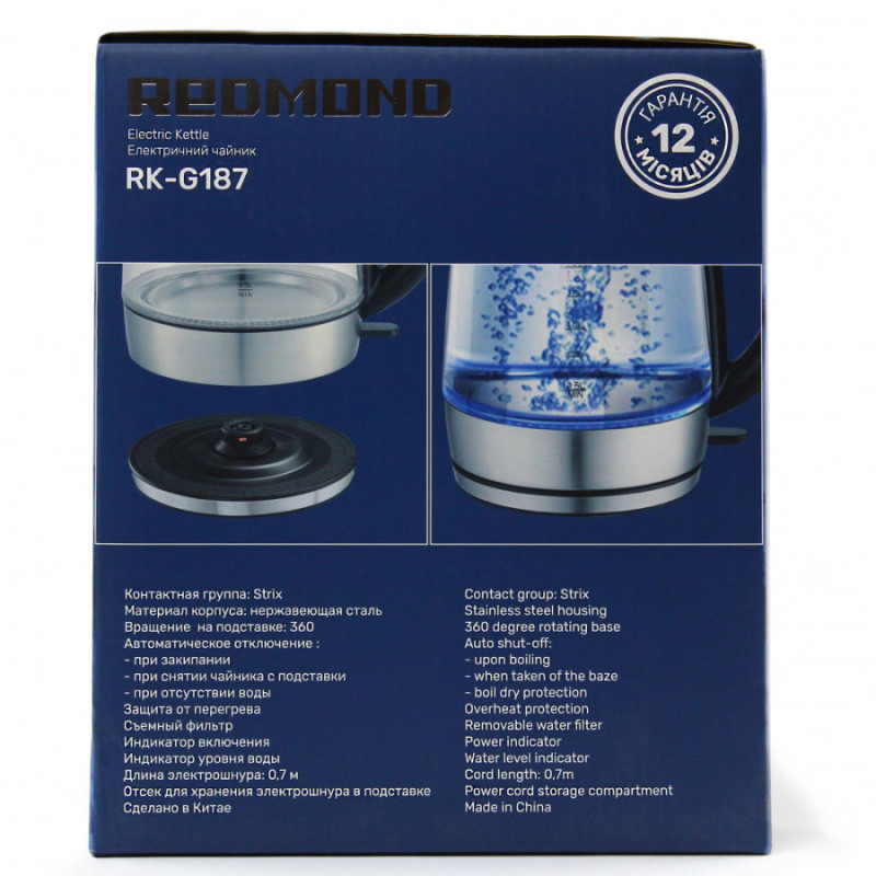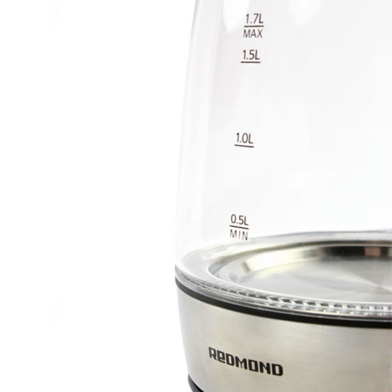 Redmond RK-G187 — удобный, надежный, качественный электрочайник в бюджетном ценовом сегменте. Модное дизайнерское решение — полностью прозрачная колба на 1,7 литра из жаростойкого боросиликатного стекла в усиленном корпусе из нержавеющей стали. У чайника скрытый дисковый нагревательный элемент мощностью 2150 ватт, который быстро вскипятит воду. Вся контактная группа, управляющая электрической начинкой этого чайника, изготовлена компанией Strix (Великобритания). Несколько степеней защиты от перегрева надежно предохраняют чайник от преждевременных поломок и прочих неприятных случайностей. Специальная конструкция подставки дает возможность при необходимости свободно проворачивать чайник на 360 градусов вокруг его оси. Это позволяет с разных сторон брать чайник и ставить его обратно на подставку. Также электрочайник Redmond RK-G187 снабжен индикатором включения и съемным фильтром, предотвращающим попадание накипи в чашку с горячими напитками.