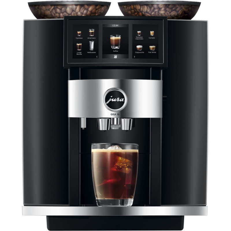 Воплощение уникального кофейного опыта. GIGA 10 – это автоматическая кофемашина премиум-класса, которая устанавливает новые стандарты производительности и переосмысливает представление о том, каким должен быть кофе.. Благодаря двум контейнерам для зерен, каждый из которых имеет свою кофемолку, революционному процессу холодной экстракции, инновационной панорамной панели для удобства использования и новой интуитивно понятной концепции управления, GIGA 10 предлагает более широкий выбор фирменных напитков, чем когда-либо ранее.. Она представлена в потрясающем дизайне, который поразительно подчеркивает мощность этой уникальной машины.. GIGA 10 воспроизводит ощущение приготовления кофе бариста в домашних условиях, превращая вашу кухню в кафе одним нажатием кнопки. Больше выбора, больше возможностей для персонализации. GIGA 10 предлагает самый широкий выбор кофейных напитков среди всех кофемашин JURA - 35 сортов кофе.. Кроме того, вы можете настроить GIGA 10 в соответствии со своими личными предпочтениями, ведь инновационный пользовательский интерфейс предоставляет практически неограниченные возможности для персонализации. Например, почему бы не насладиться белым кофе с дополнительной порцией кофе с насыщенным ароматом? Ассортимент напитков удваивается благодаря революционному процессу холодной экстракции, который позволяет приготовить любое фирменное блюдо в виде холодного заваривания.. И, наконец, новый байпас холодной воды позволяет создавать длинные фирменные напитки для бариста.. Станьте собственным баристом и наслаждайтесь настоящим кафе дома! Два керамических ножа для дополнительной вкусности. Для максимального профессионализма в кофемашине GIGA 10 предусмотрена не одна, а две высокопроизводительные кофемолки, изготовленные из долговечного высококачественного керамического материала.. Два контейнера для зерен с элегантным турбинным дизайном подключены к отдельной кофемолке, что позволяет выбрать идеальный сорт кофе или оптимальную смесь для каждой чашки.. Например, вы можете выбрать более интенсивную темную обжарку для приготовления ароматного эспрессо и среднюю обжарку для мягкого лунго или кофе с молоком.. Панорамная панель для совершенно новых ощущений пользователя. Для максимальной наглядности и более интуитивного управления GIGA 10 оснащена новой сенсорной панелью с широким панорамным форматом.. Новая панорамная панель позволяет видеть все с первого взгляда. Интуитивно понятная навигация по широкому спектру настроек в новом пользовательском интерфейсе. Просто прикасайтесь и скользите, чтобы настроить и приготовить свой любимый напиток – с помощью GIGA 10 можно легко регулировать размер, интенсивность и соотношение кофе и молока, а также молочной пены.. Высокая производительность, выразительный дизайн. Мощность и производительность GIGA 10 прекрасно выражаются в его значительном дизайне.. Передняя панель элегантного черного цвета Diamond Black с хромированными элементами и поразительная кофейная панель Panorama делают тихое, но безошибочное заявление. Два контейнера для кофейных зерен с турбиной напоминают мощный двигатель спортивного автомобиля, вызывая ощущение роскоши и производительности. Гармонический образ завершает обновленная решетка чашки. GIGA 10 воплощает в себе привлекательный дизайн и чистый престиж, п