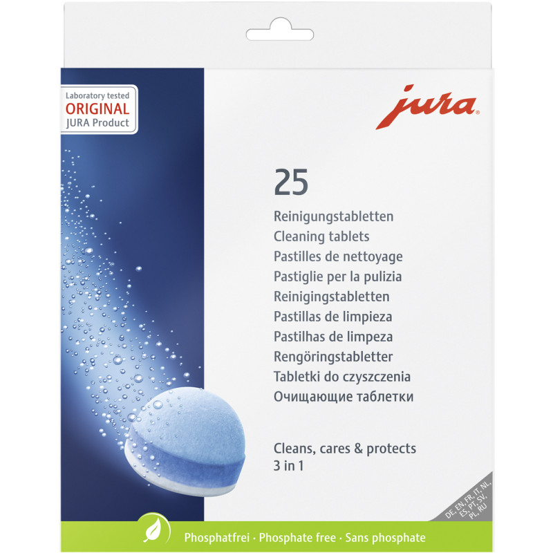 Очистка, обслуживание и защита – три в одном. Оптимальное обслуживание автоматических кофемашин и соблюдение гигиены при обращении с молоком, кофе и водой имеют решающее значение для неизменно безупречного качества кофе.. Для простоты обслуживания каждая автоматическая кофемашина JURA оснащена не требующим технического обслуживания заварным блоком с функцией самоочистки, которая активируется одним нажатием кнопки. Таблетки для очистки оригинального производства компании JURA, хорошо зарекомендовавшие себя среди миллионов пользователей, постоянно оптимизируются и усовершенствуются командой сотрудников нашей лаборатории.. Новая таблетка для 3-фазовой очистки – инновационный результат интенсивных исследований. Теперь результат ее использования стал еще лучше благодаря дополнительной фазе защиты, которая обеспечивает длительную защиту кофемашины от минеральных отложений.. Принцип использования при этом неизменно прост. Программа очистки запускается очень просто одним нажатием кнопки. 1-я фаза: Очистка. Заварной блок и сито заваривание тщательно промываются горячей водой при температуре 80 °C. При этом высокоэффективная формула очищенной таблетки удаляет остатки кофейного жира и масла, которые могут ухудшить вкус и качество кофе.. 2-я фаза: Обслуживание. Во время второй фазы – фазы обслуживания – специальные активные вещества покрывают поверхности соответствующих компонентов, тем самым предотвращая оседание остатков кофе и образование налета кофейного жира.. НОВАЯ 3-я фаза: Защита. Во время новой, третьей фазы, так называемые комплексообразующие вещества, обеспечивают длительную защиту кофемашины от минеральных отложений.. Три в одном – очистка, обслуживание и защита автоматических кофемашин JURA с помощью инновационных таблеток для 3-фазовой очистки. Это обеспечивает гигиеническую чистоту, увеличенный срок службы и идеальный вкус кофе – чашка за чашкой.. Четко выраженное осознание ответственности за окружающую среду играет такую же важную роль в компании JURA, как и бережное отношение к ресурсам и энергии. Поэтому компания JURA при производстве таблеток для очистки использует только компоненты, не содержащие фосфаты.. Оптимизированная формула гарантирует сертифицированную TÜV гигиеничность для автоматических кофемашин и одновременно заботится об окружающей среде. При попадании на кожу вызывает раздражение. При попадании в глаза вызывает выраженное раздражение. Всегда идеальный вкус кофе благодаря гигиеничности, сертифицированной TÜV. Международная независимая инспекционная организация TÜV Rheinland выдала компании JURA сертификат за микробиологическую чистоту автоматических кофемашин, присуждаемую в соответствии с жесткими критериями.. Он подтверждает, что оригинальные средства обслуживания от компании JURA, идеально адаптированные к программам