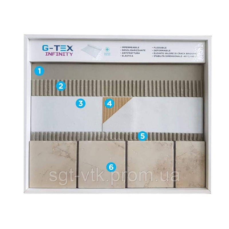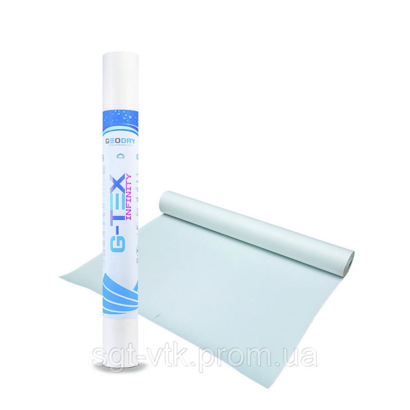 G-TEX INFINITY - полимерная многослойная рулонная гидроизоляционная мембрана, создана на основе эксклюзивных технологий, состоящая из: TNT: нетканый материал «ткань без ткани» (волокна полиэстера с высоким показателем стойкости к щелочам), которые обеспечивают высокое сцепление с специальными адгезивами GEODRY и высокую прочность при растяжении. FPO: двойной слой гибких Полиолефинов + EVA (Этиленвинилацетат) с постоянной эластичностью и переменной геометрией, что позволяет компенсировать и поглощать изменения в размерах поверхностей. G-TEX INFINITY способна компенсировать тепловые и физико-механические воздействия, к которым подвергается, без изменения структурных характеристик.