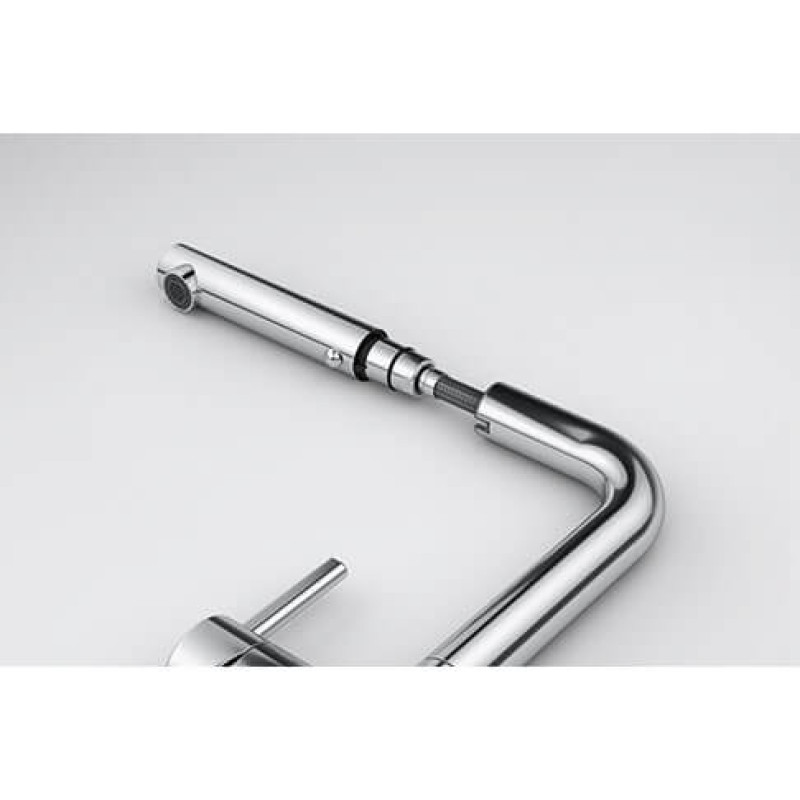 Смеситель с боковым размещение ручки управления. Вытяжной излив с функцией душа дает возможность более тщательно мыть фрукты, ягоды, травы или салаты. Смеситель может экономить воду благодаря тому, что картридж имеет промежуточное положение с неполным открытием. Ламинарный поток – легкий, тихий и прозрачный поток воды без разбрызгивания. Поток воды – 7.5 л/мин (3 бар)
