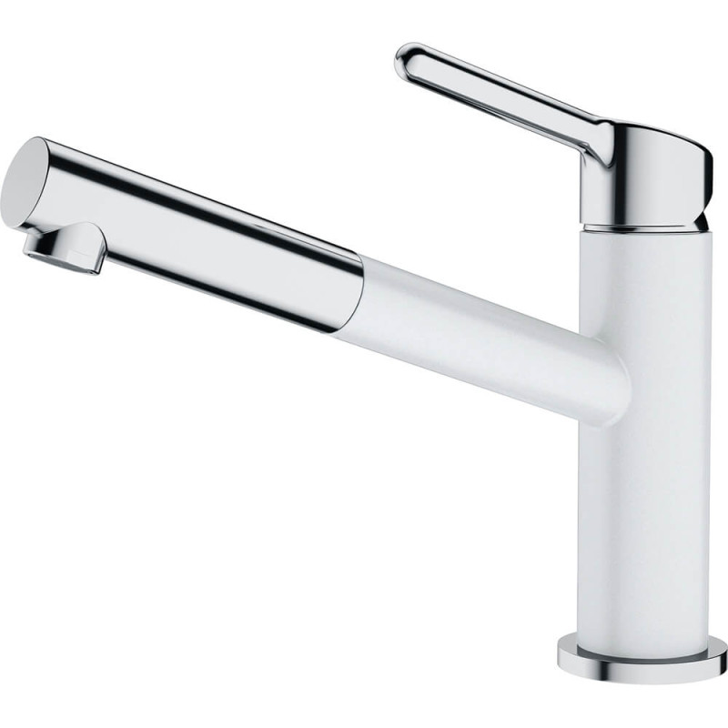Смеситель с верхним размещение ручки управления. В среднем положении не смешивает воду, а подает только холодную, таким образом осуществляется экономия горячей воды. Вытяжной излив дает возможность наполнять емкости вне чаши мойки. Смеситель может экономить воду благодаря тому, что картридж имеет промежуточное положение с неполным открытием. Ламинарный поток – легкий, тихий и прозрачный поток воды без разбрызгивания. Поток воды – 9 л/мин (3 бар)