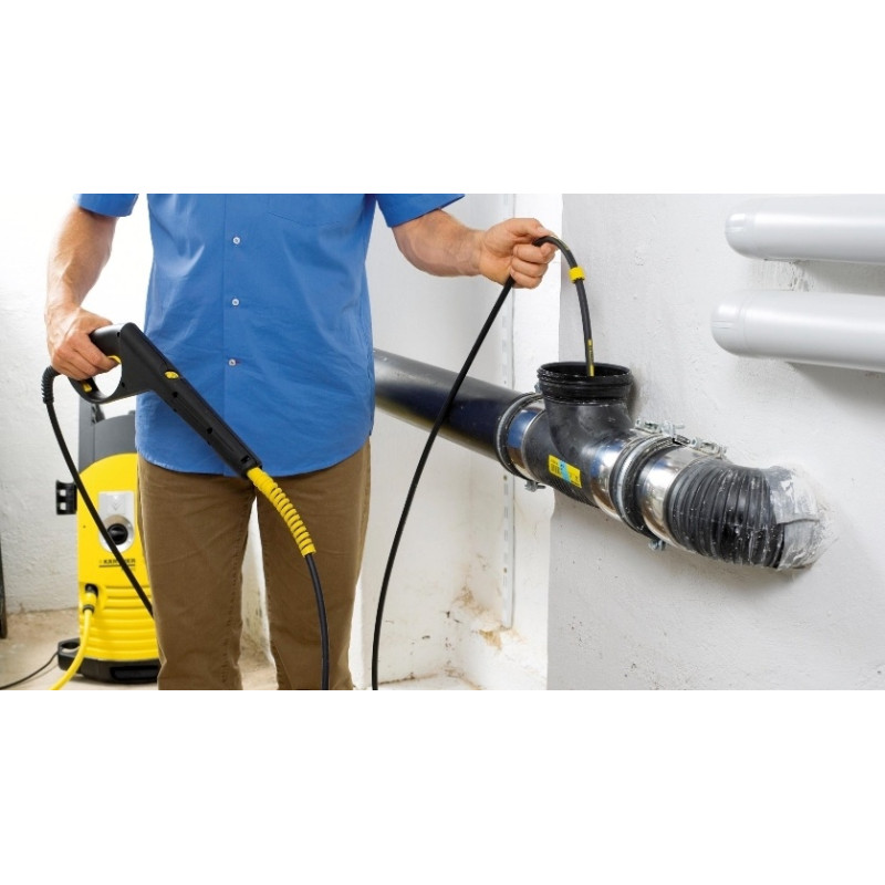 Позволяет прочищать засорившиеся трубы и стоки. Четыре направленные назад струи высокого давления обеспечивают продвижение шланга по трубе и удаление грязи. Высококачественный гибкий шланг снабжен отметками и маркерным кольцом, позволяющим отслеживать продвижение по трубе. Шланг армирован текстильной оплеткой, защищен от перегиба, снабжен очень коротким латунным соплом для максимальной подвижности и долговечным латунным разъемом. Комплект для бытовых аппаратов высокого давления Kärcher может применяться внутри дома и на открытом воздухе. Совместимая техника
