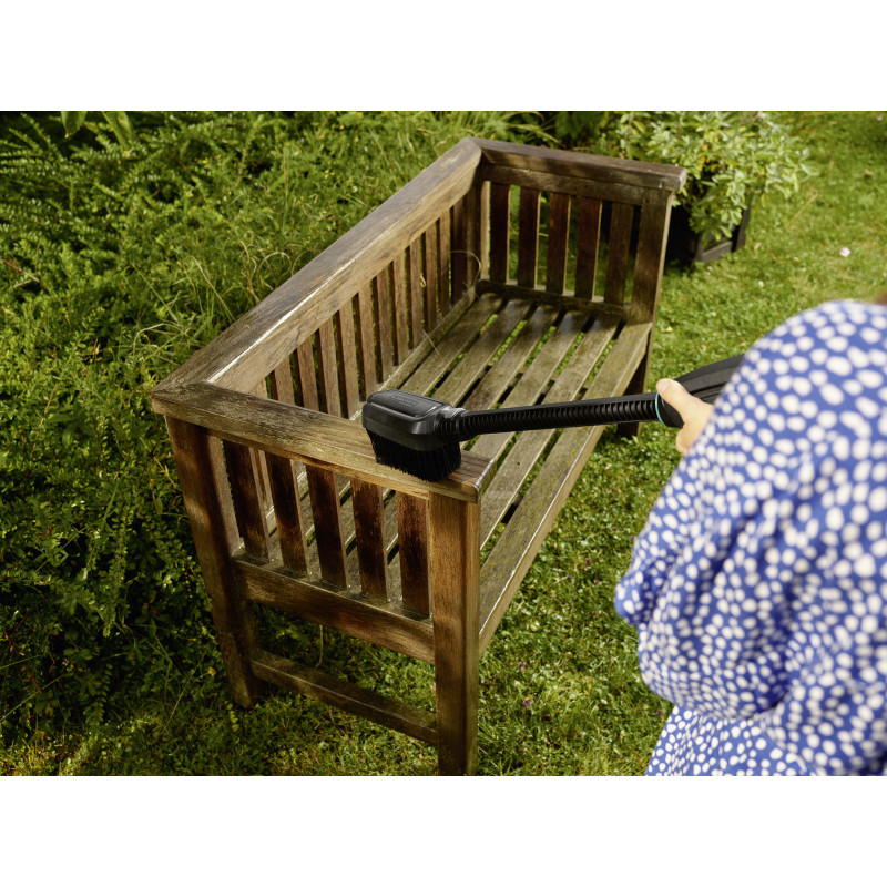 Особенно стойкие загрязнения (например, налет клейкой пыльцы на садовой мебели или присохшую грязь на цветочной кадке) не удается просто смыть струей воды. В таком случае необходима подходящая щетка. Моечная щетка WB 24 Handheld, разработанная специально для аппаратов среднего давления Kärcher, гарантирует превосходные результаты чистки. Сначала поверхность увлажняется формируемой ею веерной струей воды, а затем обрабатывается щетиной очень большой длины. При этом возможность поворота щеточной головки с шагом 90° позволяет удобно очищать различные места. В заключение отделенная от поверхности грязь смывается веерной струей воды. Подача воды производится только при нажатом рычаге аппарата, что обеспечивает ее экономное использование, а также способствует сбережению заряда аккумулятора. Разъем Quick Connect позволяет одной рукой отсоединить от удлинительной трубки моечную щетку и установить вместо нее другую принадлежность системы Handheld. Щетка WB 24 Handheld совместима с аппаратами среднего давления Kärcher (KHB 5 Battery и последующими моделями), но не подходит к аппаратам высокого давления классов K 2 – K 7. Совместимая техника