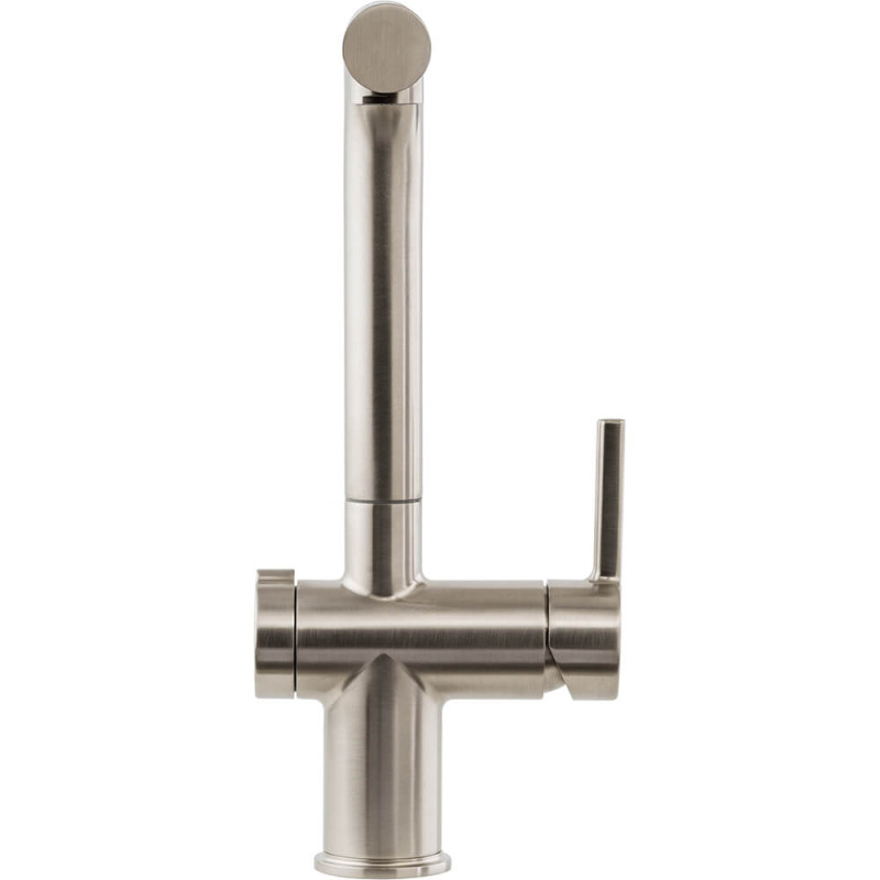 Змішувач із двома ручками управління, одна ручка до якої приєднується трос вентиля-ексцентрика. Витяжний вилив з функцією душу дає можливість ретельніше мити фрукти, ягоди, трави або салати. Змішувач може заощаджувати воду завдяки тому, що картридж має проміжне положення з неповним відкриттям. Ламінарний потік – легкий, тихий та прозорий потік води без розбризкування. Потік води – 7.5 л/хв (3 бар)