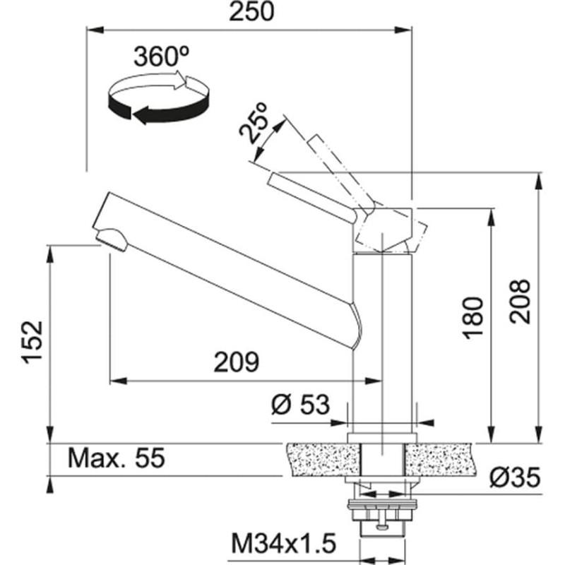 Смеситель с верхним размещение ручки управления. В среднем положении не смешивает воду, а подает только холодную, таким образом осуществляется экономия горячей воды.  Имеет фиксированный излив, который не вытягивается. Смеситель может экономить воду благодаря тому, что картридж имеет промежуточное положение с неполным открытием. Ламинарный поток – легкий, тихий и прозрачный поток воды без разбрызгивания. Поток воды – 12 л/мин (3 бар)